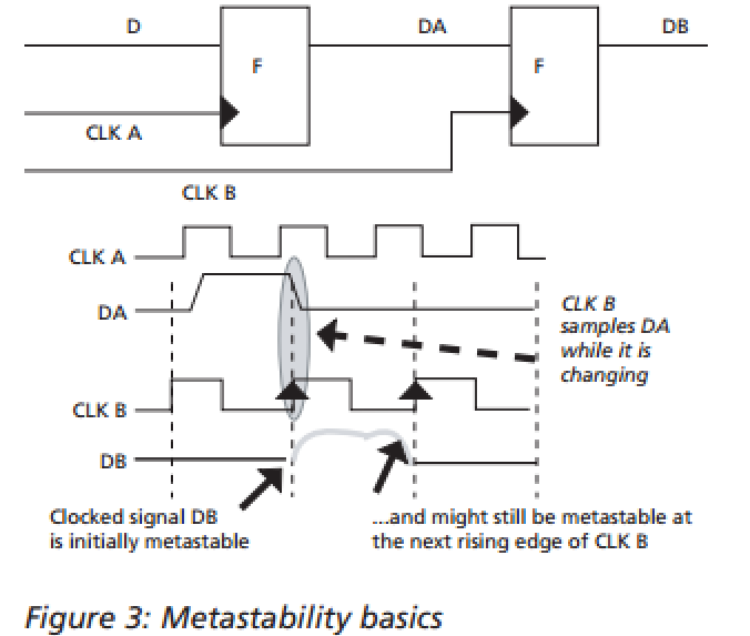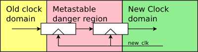 하나의 clock domain에서 데이터를 주고 받을 때 발생하지 않는 문제들이죠. 속도가 느린 Old Clock Domain과 속도가 빠른 New Clock Domain에서 데이터를 주고 받을 때를 가정하겠습니다. 만약 Old Clock Domain에서 데이터를 변경하는 동안 New Clock Domain의 clock이 rising edge가 되어 데이터를 받아간다면 이 때 가져간 데이터는 metastable state에 빠지게 됩니다. 충분히 안정되지 않은 데이터를 가져갔기 때문입니다.
