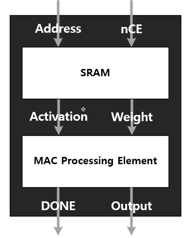 Controller는 address와 nCE를 생성해주고 이로부터 나온 데이터는 MAC 연산을 수행하는 PE로 들어가서 연산을 수행합니다.