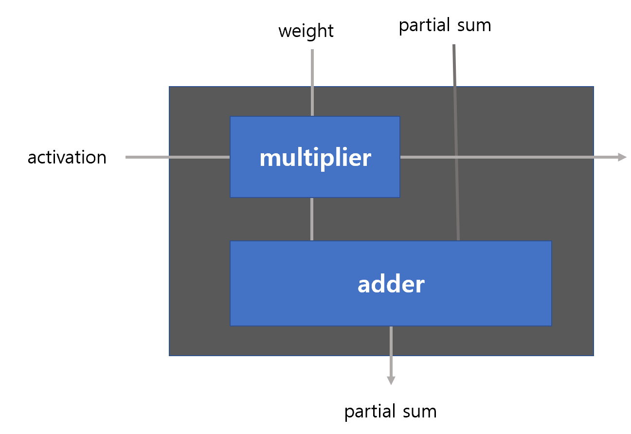 일반적으로 systolic array에서의 processing element 또는 연산기는 위와 같이 생겼습니다.