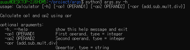 | help | 각 인자에 대한 설명 | -h/--help 옵션을 넣었을 때 각 인자에 대한 설명 |