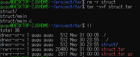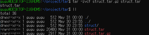 먼저 있었던 tar파일을 지워주고 압축 해제를 진행하면 같은 용량의 struct.tar 파일이 생성된 것을 볼 수 있습니다