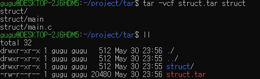f 옵션으로 묶을 폴더를 지정하고, v 옵션으로 struct 폴더 내의 데이터가 묶이는 과정이 출력됩니다