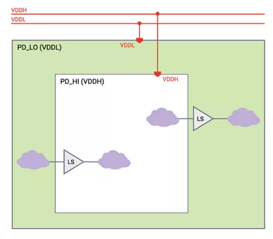 칩 안에는 다양한 모듈들이 있습니다. 어떤 모듈 A는 고성능으로 동작해야 하며, 어떤 모듈 B는 낮은 성능으로 동작할 필요가 있습니다. 여기서 A의 성능을 위해 A와 B에 모두 높은 전원을 사용하게 되면 B에는 불필요한 높은 전원이 공급되어 Dynamic power가 증가할 것입니다. 따라서 그림 2와 같이 power domain을 분리해 A에는 높은 전원을, B에는 낮은 전원을 사용하면 사용되는 Dynamic power를 줄일 수 있습니다.