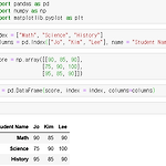 Python에서 pandas와 matplotlib를 이용해 그래프를 그리는 방법에 대해 알아보겠습니다. 위와 같이 세 학생의 'Math', 'Science', 'History'라는 교과목의 점수를 바탕으로 DataFrame을 만들었습니다. Bar graph 위와 같이 pandas와 matplotlib를 이용하면 쉽게 그래프를 그릴 수 있습니다.plot()함수에는 다양한 파라미터들이 존재하니 자세한 내용은 아래의 링크를 참조하시길 바랍니다.https://pandas.pydata.org/pandas-docs/stable/reference/api/pandas.DataFrame.plot.html